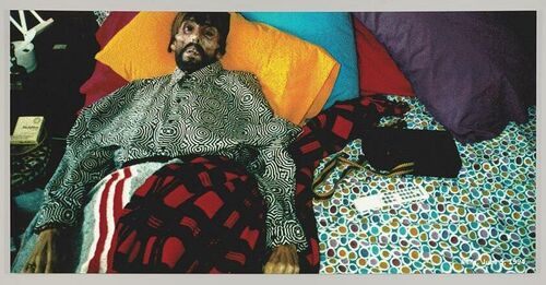 同是纽约之行,在惠特尼美术馆被AA Bronson的巨幅作品震撼。Bronson拍摄了挚友Felix Partz因AIDS死后不久的一幕。Partz睁着眼睛躺在床上,穿着最喜爱的衬衫,头下枕着橘黄和天蓝色的小枕头上,碎花小被子上摆着遥控器和播放机,床头柜上放着香烟。就像一个弥留之际的病号,但是却十分舒适,被自己喜爱的消遣之物包围。Bronson把自己的朋友照顾得很好,以临终关怀的方式直面友人的离去,也让人们看到一个被艾滋病啮噬的干瘪身体。