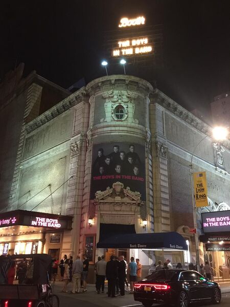 百老汇大街华灯初上,霓虹舞动。露天酒吧的音乐,沿街叫卖狮子王门票的小贩混杂着时代广场的热曲,头晕目眩到心慌。而排队等候The Boys in the Band的观众清爽雅致的装束,三三两两柔声细语的交谈场景,却像递给双眼的一杯冰镇薄荷酒,视觉上安抚了大都会声光电给我这个来自德国的乡巴佬,带来的躁动不安。再一次服气gay couple们时刻将自己变成环境中的一件艺术品的好品味。很多入场的同性伴侣都是泰然自若地挽着手,有说有笑,缓步入席。