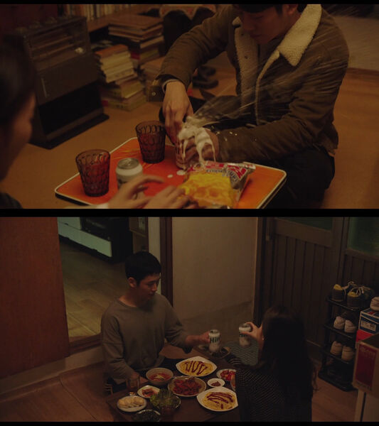 15.t美秀住在这里的时候,贤宇第一次来,他们饭桌是放在房间里面吃;而贤宇住的时候,美秀来吃饭,饭桌是放在厨房吃的。丁海寅说这个设定大概是想表达美秀比较积极,也是主动向贤宇敞开心扉的,所以在房间吃;但是贤宇有心理创伤,心是锁着的,所以在厨房吃。