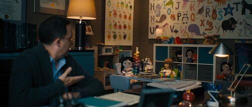 在医生的房间里,我们可以看到正坐C位的安娜贝尔(导演的成名标记),以及大量DC彩蛋,包括神奇女侠、蝙蝠侠、闪电侠、绿灯侠的玩偶,以及字母表上的“小动物”: