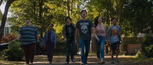 值得留意孩子们的衣服,比利的衣服上印着**《七宝奇谋》(The Goonies)**的图案,这部影片讲的是几个小孩的冒险故事,导演是执导里夫版《超人》的理查德·唐纳,当年主演的小孩中有“灭霸”乔什·布洛林和新晋奥斯卡最佳男配角关继威。