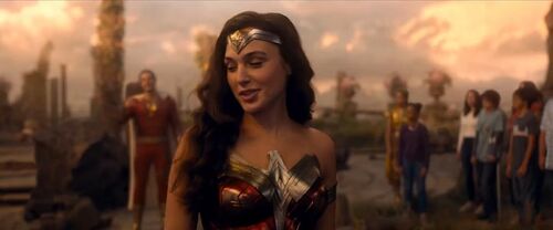沙赞家族将比利埋葬在希腊神殿外的土地上,墓地一旁是那棵枯萎的圣树。老巫师说只有神力的火花才能复原这里的生机,但已经没有神了。这时,一个神圣的身影出现在众人面前,是神奇女侠!有头的!(盖尔·加朵本人的头)