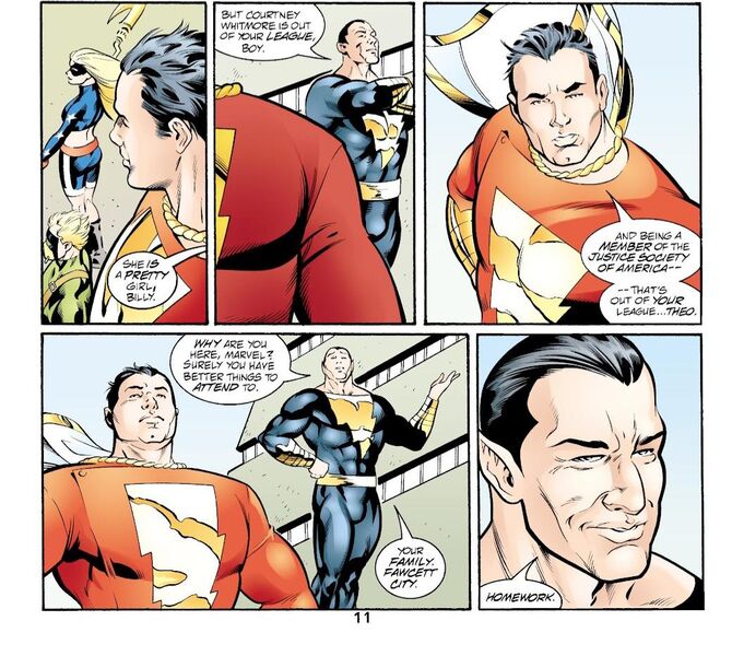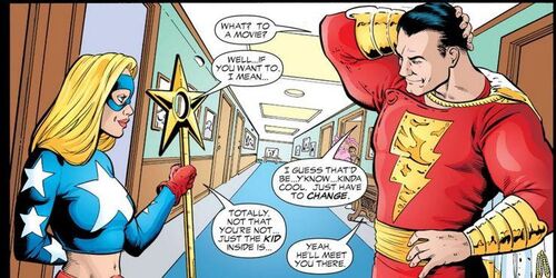 漫画中,沙赞(当时还是Captain Marvel)的时候曾加入美国正义协会,与黑亚当一起在组织中担任主力。