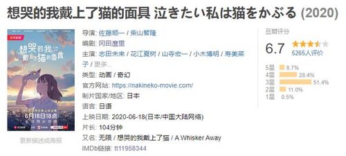 总的来说,《想哭的我戴上了猫的面具》这部片子无论内容质量还是播放渠道都不是特别令人满意,只能作为疫情片荒时期打发时间的消遣吧。