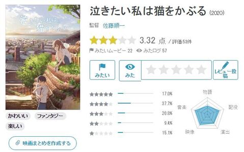 目前《想哭的我戴上了猫的面具》的豆瓣评分为6.7,在日本雅虎映画的评分为3.32(满分5分),不少评论都提到了影片与宫崎骏、新海诚作品过于类似,日本动画内容过于同质化的问题。