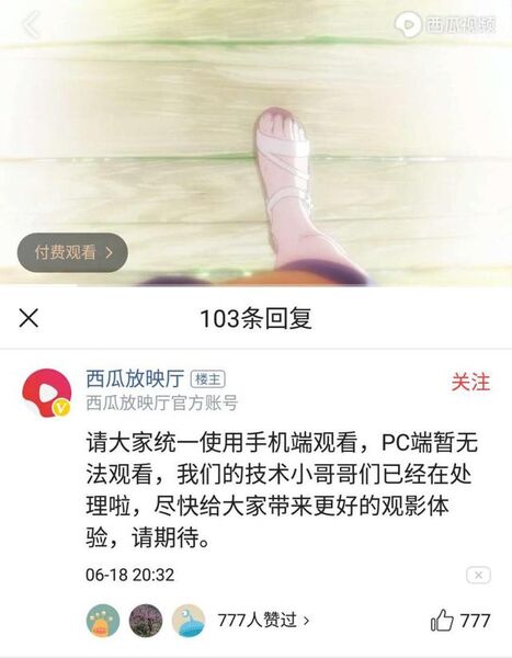 尤其《想哭的我戴上了猫的面具》还是付费观看,同期上映的网飞虽然也是付费模式,但是却可以在电视、电脑端播放,相比之下,西瓜视频的手机播放简直是在劝退影迷。