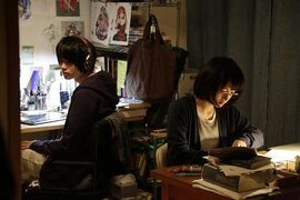 唯一能够给人以慰藉的,大概就是宅男卓也与女主的恋情了吧。影片伊始,房间的布置、座椅的朝向已经揭示了他们之间疏远隔绝的关系。两人背对背,各自面向自己的书桌耕耘,她写她的哲学,他画他的巨乳。卓也为晚归的女主煮了泡面,两人心知在一起不合适,只是埋头大声吸溜面条,好聚好散,令人鼻酸。影片还是缀了个光明的尾巴。男友将女主的睡颜画成了漫画,珍藏在信封里,被一个人收拾空落落房间的女主发现,泣不成声。你看,即使人与人之间无法沟通,也还有相爱的可能。