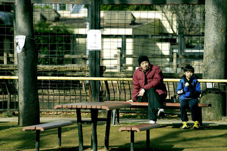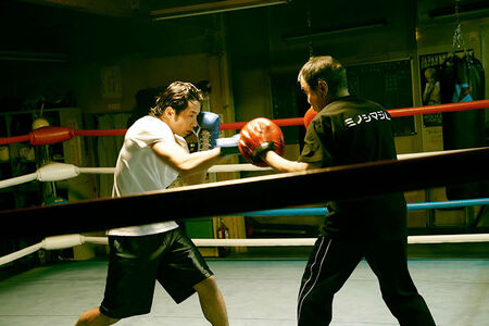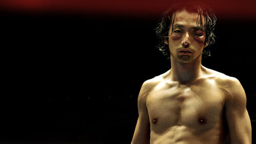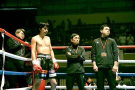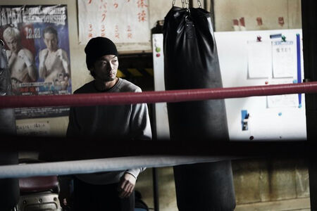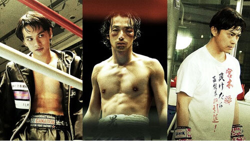 没有穷凶极恶的反叛,有的是对自己和生活的无力和不安。三只“败犬”,总是被人说“无聊”的搞笑艺人宫木瞬(胜地凉 饰)面对拳击是为了证明自身存在。不断被揍被揍,却又不断站起的宫木瞬妄想和原日本第一的晃拼一拼。第二位对手是满溢着拳击梦想的天才,原恶童大村龙太(北村匠海 饰),两位作为败犬在此站立起来面对拳击。而作为主人公的末永晃被教练认为“你没有打下去的理由”,这是不同于其他两位的设定,让他内心坍塌掉,在这其中他对拳击的坚持仿佛是一种勉强为之,晃的动机归于何处?可能是观众需要在其中摸索的存在。但当影片展开,我发现晃之前作为职业拳击手是一个只有拳击的人,而当他坠落时生活收掉了他所有的神通。片中一个侧面表现的是晃的老爸(柄本明 饰),一个终日窝在布团中喝烧酒的人。却是从小鼓励他「要成为世界冠军」的所在。在晃和搞笑艺人对战后的大败扫空了所有人对他仅存的期待,此时也只有老爸说:“拳击可以停了,你已经够努力了。”他只是在维持,但现在他连维持的理由都没有了。