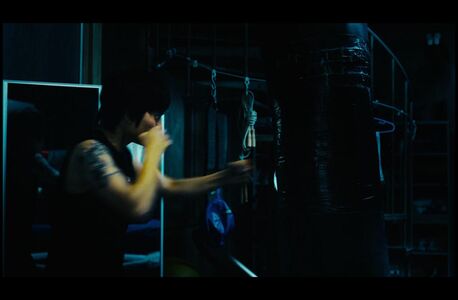 片中晃日常的场景都被染上了蓝色。他成为了陪斗犬,没有停止生活但离职业拳击越来越远。在台上沸腾过的他被煮进了周遭的琐碎了,似乎随时可以离开拳击。但他内心起码认为:我还有拳击。生活中行动需要理由,但拳击似乎不需要,拳击可以碾碎限制,让大脑和身体一道进行疯狂地精密计算。