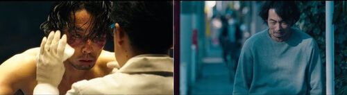 片中森山未来在饰演的晃生活中少言寡语甚至还有点戏谑自身的无赖感,委身而行,眼神闪躲。恨不得低到尘埃里。而当他站上拳台,深夜里,强光下的晃像一座山般屹立,眼中射出乖戾的目光。晃在场上眼白发蓝的景象让人不寒而栗,无法预测下一秒的情形,像野性回归的兽物。这种晃身心状态的精确切分也让我深感过瘾,森山老师的绝佳表现力。