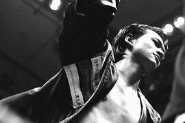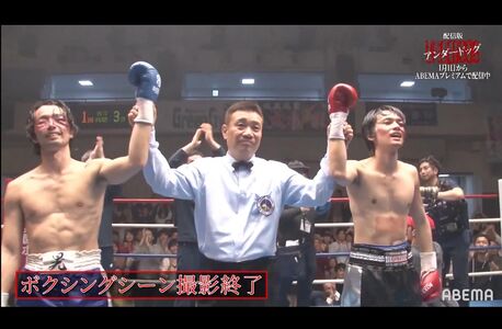 晃在深夜疯狂练习时,头顶上出现了和当年《百元之恋》中相似的标语:Standing and fight。晃最后从糜烂中站起来了,但还是被捶的遍体鳞伤。晃在拳击台上被打到视力瞬失时,“让我打下去”是他对医生说的一句,也是他态度的表明。当和大村亮太这样打下了这场比赛的最后,两人靠在一起拥抱。似乎就是几年前《百元之恋》中被胖揍的一子喜欢比赛结束后双方互相拥抱的感觉,是对对手的敬意,也是对自己的敬意。