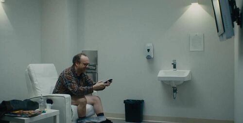 耷拉着内衣裤的男主取精时看A片,对A片画面和声音感到厌烦,恶心,准备用遥控器将显示器关闭,遥控器失灵,使劲按,拍,遥控器壳散了。这是一个偷窥镜头,通常我们看不到一个中年人以这样的样子出现,毕竟中年人更注重体面。只有亲密的人才会看到一个中年人疲惫、邋遢、恶俗的样子,所以这场景很能使观众共情。