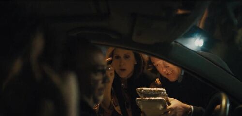 很短的片段,表现配角常用的一个手法,集中场景对同一事情的不同反应,不需要麻烦得搞来搞去,不让配角占更多时间,让观众情绪基本留在主角这边,但要把配角的形象弄出来。女配还在质问,男配把打包好的食物给他们。一切不言而喻。