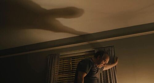 这是本片最棒的一个场景,同样不是刻意搞出来的,他们晚上休息,男主用书捅天花板表示抗议,然后一只手扶着休息,主光是床头灯,完美一分为二的画面,上面是男主巨大的影子,仿佛影子压着他。暗示着他内心挥之不去的阴影和巨大的压力。