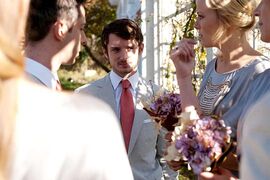 恩,我感觉到了,感觉到了转折,但是没有想到当他说出“but the thing is, without words, I have nothing.”于是就暴雨了,于是新娘根本没有反应就跑了,当大家都纷纷离席,唯有他二人在雨中相视一笑。【泯恩仇了,有木有有木有】