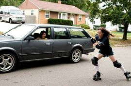 然后我回去认认真真地将Juno看完。并且深深地喜欢上了这个女孩子。在Whip it里,她依然是那个丑小鸭一样的小女孩子。戴着大大的眼镜。灰溜溜的。一出场就把头发染成刺眼的蓝色。被妈妈骂。妈妈希望她做一个优雅的淑女。她偏偏喜欢轮滑。看到别人穿着轮滑鞋子。她的两眼灼灼放光。于是她瞒着妈妈去参加极速轮滑比赛。小小的身体遇到了巨大的冲撞。而她勇往直前。摔倒了爬起来。又被撞倒。然后再站起来。Be ruthless.