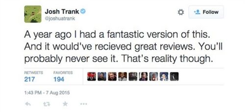 2015年8月9日,《神奇四侠》(2015)上映当天,作为导演的乔什发推表示:“一年前我曾有个‘神奇’的想法,它本来能够获得赞赏。你们也许永远看不到了。然而这就是现实。”其实早在上映之前,《神奇四侠》制作期间的各种不和传闻就已经在坊间流传,例如,关于导演与片方和工作人员之间的不和,与主演之间的不和,以及选角风波引发的死亡威胁事件,而这些大部分都是真实的,年轻导演与资质深厚的工作人员之间的合作不协调,年轻导演因缺乏与新生代演员的沟通经验而产生的不和,年轻导演因为想改变现状而选择了黑人角色出演历来都是白人担纲的超英人物而招致死亡威胁,这无疑给乔什拍片带来了重重压力和阻力,他甚至在拍摄期间需要携带枪支防身。因此,当他把影片第一个剪辑版本交付福克斯高层过目的时候,他们才显得如此措手不及。随后就是传闻中这部电影所经历的大量重拍、重制,而据乔什所言,福克斯公司在没有知照他的情况下进行了这些操作,而这也导致了美国导演公会的介入,这才有了两个版本进行试映之说。但最后在看到制片厂的雷厉风行之后,乔什最终妥协了,他终究不是特瑞·吉列姆 ,这一切可以说完全超出了他能理解和控制的范围,他深陷挫败和失望的泥沼。而这只是开始。《神奇四侠》上映后成为了史上最差的漫改电影,不仅在票房方面一塌涂地,也让乔什失去了很多正在进行和潜在的合作项目,例如参与制作卢卡斯影业的下一部星战电影的机会,据说就是《星球大战外传:侠盗一号》(Rogue One: A Star Wars Story,2016)。自此,乔什被判入了所谓的“电影监狱”(Movie Jail),如被雪藏一般。