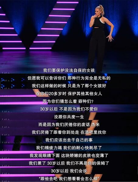 404老师推荐了Iliza这名白人女演员,unveiled是我第一次看她的专场,感想:形式丰富,内容酷炫。1.形式1.1形象伊莉莎老师的表演风格可以用张牙舞爪来形容,一身腱子肉和高跟鞋以及马尾辫包括颜色诡异的口红都是她的演出道具,塑造一个“我可不怕吓着你”的形象。去掉以上部分之后她的造型又是很女性化甚至堪称妩媚的。结合起来看就很女权。1.2台词伊莉莎老师喜欢讲一些高谈阔论的道理,她的语速极快,语调和嗓音很夸张(比如低哑而正常的声音作为第一人称,黑嗓是情绪崩溃的第一人称,尖厉的“女”声作为被讽刺的女性第三人称,低哑而弱智的声音作为被讽刺的男性第三人称),用声音和语速来快速切换角色,让人在听大道理的时候也能不无聊。这部分的表演堪称口技了。1.3用典伊莉莎老师将穿着婚纱戴着头纱的新娘演出了好些个邪典典故比如:丧尸,驱魔人,异形。面纱罩脸给她这么一演还真就跟抱脸虫是一个原理,越想越对。驱魔人倒爬这个点子也很妙,伊莉莎老师是穿着细高跟鞋完成的这个表演,算是杂技了。最后谢幕伊莉莎老师咬了一嘴血浆,一点都不突兀,与重型配乐一起将整个场面气氛推到了高潮。一个人,不借助任何道具,在舞台上营造出一个个电影场景,这种气场,非常强大。2.内容主题讲的是美国白人婚礼的风俗糟粕因为伊莉莎老师自己刚结完婚。收到伊莉莎攻击的对象有:键盘(主要是女)侠,假装互相鼓励实际只是怕得罪人的一般女性,美国度量衡,婚礼策划师,毫无参与感的新郎伴郎和爸爸,假装看重友谊实际只想刷存在感的首席伴娘,以及主要还是吐槽风俗文化指定的整个婚礼流程。伊莉莎老师以叙事的方式把婚礼流程捋了一遍,放大讲这个过程中新娘遭的罪,从袜圈到单身派对,一个一个展开讲。同时新娘还得是婚礼的组织者,负责所有张罗操纵协调指挥付钱。(这里有剧透)最后婚礼当天呢新娘被盖上了头纱啥都看不到。(这里有打拳)活脱脱一个被父权制卖了还替父权制数钱的受害者形象,令人痛心。吐槽婚礼的段子很多人都讲过,伊莉莎老师能把这讲到一整个专场的长度还是很见功力的。这还不止是创作和表演能力。有的人办婚礼为了省事不会费那么大劲走那么多流程,有的人处理不了那么费劲的人际关系所以根本不了解别人的婚礼是什么样的,有的人劳心劳力办完一场体面婚礼之后需要用好几年的时间来疗伤以忘掉婚礼的经历。伊莉莎老师能那么快从婚礼中复原并弄出一个专场,她顽强的生命力和充沛的体力是令人赞叹的。我非常欣赏她的“将婚礼邪典化”的点子。婚礼是一种表演和美幸福的仪式,操办婚礼的过程则是一对新人从两个独立的主体过渡成一个主体的磨合,(此处有打拳)尤其对于女性来说是突然感受到“主体性丧失”“身份丧失”“自我丧失”的时刻(此处打拳结束),婚礼很容易成为矛盾集中高发、新人情绪崩溃的巅峰,有很多优秀的文艺作品都是表达这一主题的比如拉斯冯提尔的《忧郁症》,很文艺很疯也很真实。伊莉莎老师将这种崩溃荒诞化,是非常自然非常顺滑非常能引起女性共鸣的,所以虽然她看起来在吐槽女性但其实是在讲妇女心声,虽然在讲女权但是看起来又是在骂女人,立场十分巧妙。3.其他的一点感想看了《一年一度喜剧大赛》里王梓的默剧表演,想到,他这种表演形式其实很多西方stand-up comedian包括伊莉莎老师的表演里都有了,人家除了演之外,说得也很扎实,伊莉莎老师一场演下来,有默剧,有口技,有杂技,有演讲辩论奇葩说。这得花多少时间多少心思去练习呢。手艺都要靠工夫堆出来。还要自觉。太难了。