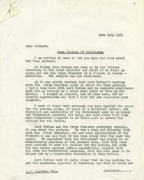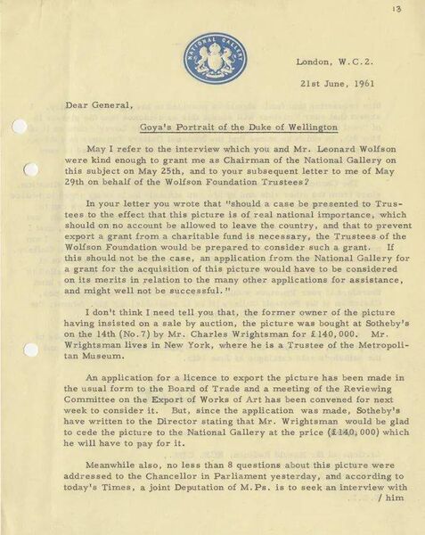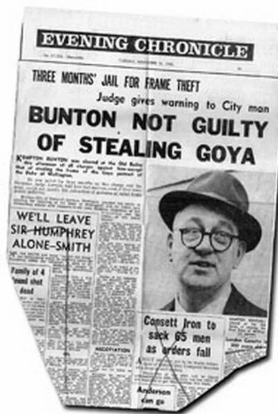 1961年,弗朗西斯科·戈雅(Francisco Goya)的《惠灵顿公爵肖像》(Portrait of the Duke of Wellington)画作被一位美国大亨在拍卖会上从一位英国贵族手中购得。随后,英国政府介入购买该画作,并将其留在英国,它于那年 8月2日在英国国家美术馆展出。8月21日,作品被盗,直到四年后才再次出现。