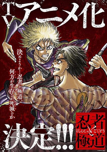 以现代日本为背景,描绘忍者与极道之间激烈对抗的动作漫画。1657年,在明历大火的背后,由幕后江户守护者神赛惨蔵与始祖极道、江户第一任侠幡随院长兵卫的死斗引发的忍者与极道的宿怨,至今仍在延续。极道,既是那些被社会孤立之人的唯一归宿,同时也因犯下诸多恶行而屡遭企图消灭极道的忍者袭击。 竹本组的“幕后组长”兼“破坏之八极道”成员之一辉村极道,为了彻底消灭忍者,使用了一种能异常强化身体能力的毒品——“地狱回数券”,并在东京各处制造引人注目的骚乱,以此引诱察觉恶行而来的忍者。在这场骚乱中,一个不受法律与权力束缚、致力于阻止极道恶行的忍者团体“帝都八忍”中的一员被杀,包括“多仲忍者”在内的同伴们燃起了对极道的复仇之火。 另一方面,表面上过着高中生生活的少年“忍者(忍叶)”和表面上作为精英上班族生活的青年“极道(极美)”,因女童向动画《公主系列》的话题而意气相投...