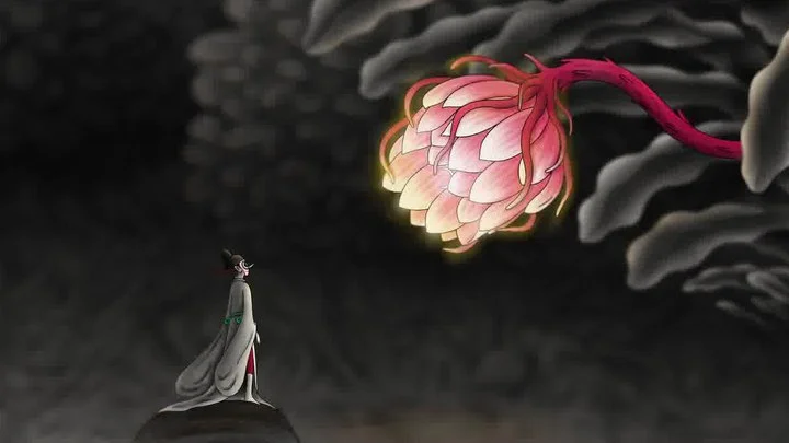 为了不“困于所溺”,我们每个人,都需警惕自己耳中那不停絮语、并试图将我们引向镜中幻境的“小人”。 看完短片,不明所以。这时候我尝试从头到尾对梳理故事情节分片段梳理,发现这个短篇的寓意与它讲述故事的方式直接关联,梳理完情节,核心指向也清晰了起来。 短片的情节可梳理为七个环环相扣的片段:1. 书生于迷离夜色中窥见“耳中人”幻象,得其“天书”,获“顺风耳”,化蝶潜入《牡丹亭》式的游园春梦,对叹春的小姐忘情呼唤,惊破幻境。2. 书生惊醒于书房,然“小姐”之声萦绕不去,似源于耳内。借助镜与笛孔,他窥见耳中确有一“小人”。求医问治,郎中的掏耳勺反被“小人”撕碎,宣告外在干预的失效。3. 书生睡去,“耳中人”自行离耳,于园中痴望昙花一现。4. 一座形如戏台的“眼睛房”显现,台上正演绎才子佳人故事。书生凑近窥看,“耳中人”竟顺其耳道走出,径直踏入戏台世界。5. “耳中人”在戏台世界中走向“小姐”,却骇然发现其为提线木偶。虽心生退意,终又“拼命上前搭救”。6. 现实中的敲门和喊声将书生拉回,戏台上“耳中人”已失,唯余一滩血迹。7. 镜头回转至故事起点:书生夜出观昙花,房门洞开,红光如漩涡将其吸入——他最终步入耳内,化身为自己当初在镜中所见的那个"耳中人"。 故事情节分析到这里,可以看出《耳中人》,是典型的故事套故事的嵌套结构。大故事是书生的现实视角,由书生的这个视角展开两重小故事,小姐游园和耳中人。最后故事也由书生收束。 再整理一遍,提取核心要素,这个叙述就是书生——耳中人、游园小姐——书生,也就是现实——幻境——现实,当然最后书生又走入了耳中的幻境。 蒲松龄的虚幻故事,很多都能找到现实和虚幻之间的转接口,书生是被邻人敲门扰醒的。 那么这里多个故事串联成闭环,也就可以说耳中人、游园小姐都是书生的幻象。书生的笔筒,本该承载书墨,上面刻的是青花美人,书生抬眼一看,嘴角上扬。中国有才子佳人,西方有骑士公主,对轰轰烈烈的拯救,经历一番磨难之后终成眷属,这样的浪漫故事以及对青年男女对虚幻浪漫的执着和追求并不稀奇。 书生因执念产生幻象,最后又自己走入幻象,发现自己就是耳中人,耳中人就是自己,这里书生完成主体客体的移位,完成自我欲望的戏剧化投射,他观看的耳中人、小姐游园的故事,其实观看的是自己的内心。而我们观看的,是欲望如何建构自我囚禁的牢笼。 故事开始时,小人遗落灯笼被书生捡到,书生拿起来看,灯笼上的"雨"字,或许就是是“欲”。 书生、耳中人各看到两次昙花,游园中的小姐也出现两次。耳中书生看见小姐之前,看到昙花。现实中书生看完耳中小人的故事之后、走入漩涡之前也看到昙花。那么可以理解成,“昙花”意象两度出现,是作为串联起幻境与现实的关键意象。它既是转瞬即逝的美(小姐),亦是不可企及的理想(爱情),直指书生屏风上的题字:“春梦短,天涯人远意匆匆”。 美好的速朽性、短暂性,反而催化了永恒的、深沉的执念。