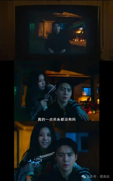 还有下面这幕,都拉美出现在电视机里,实际是车茂熙内心的具象化表达,已知都拉美是代替她做不敢做的事、问她不敢问的话,甚至可以开枪威胁。