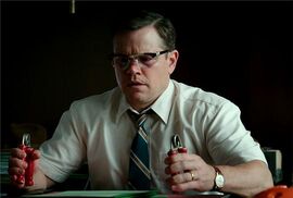 好了,从这里开始,马特·达蒙成为了科恩兄弟(编剧)笔下那种拿不出恨劲儿,又十分贪婪的人物,他的命运从一件自己设计的坏事开始,被别人拿住把柄,然后就会像多米诺骨牌一样顺势倒下,直至失控。
