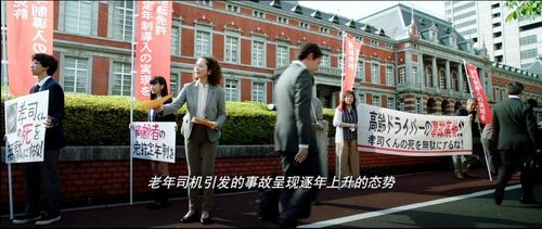 电影中橘沙穗在第一天去刑事部上班的路上遇到了一群在请愿限制驾照年龄的人。
