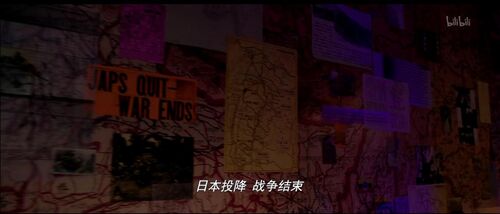 在日军英帕尔作战计划中,亲敦江渡河作战是重要的一环,同时亲敦江也是日军最终退回的地点。影片中酒吧“亲敦江底”门前红灯笼旁放有一个士兵头盔,店内墙壁上有印缅地区的地图和他收集的新闻报道。并配有文字“日本投降,战争结束”。