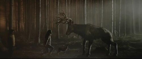 谜底揭晓,薄情寡义的老爹跟着一个捕猎野生动物的非法团伙,抓回幼鹿,激怒巨鹿,由此被疯狂报复。