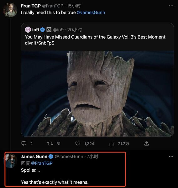 按照电影设定,格鲁特的语言其实近乎一种情感表达,他说的话并没有具体的措辞。