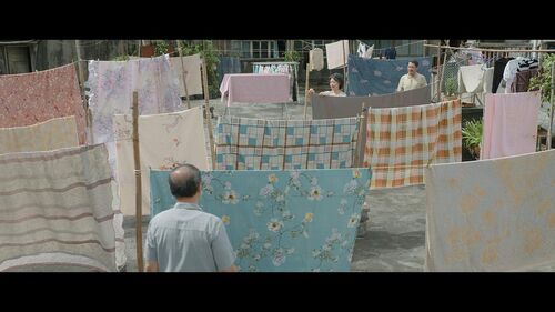 11. 影片采用了三种画幅,分别对应的是2.39:1的现实时空,16:9的纪录片画面,以及4:3的黑白电影戏中戏。其中戏中戏为了致敬胶片电影年代,音效上也加了胶片放映机放映的底噪。本片在拍摄现场的摄影机浓度非常高:有拍戏中戏《似是故人来》的机器,有拍纪录片《回故乡的人》的机器,有拍影片《走走停停》的机器,还有拍Making of的机器,而且是挤在一间小小的屋子里。