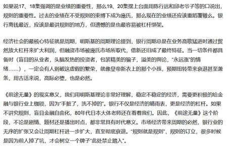 金融反腐是今年以来最为关注的话题。也因此,我认为好的作品确实是印证和引领时代的。为什么今年央视连续推出了《城中之城》《前途无量》两部银行类型剧,宣传交替印证了“高质量发展”的时代特征。银行的系统性贪腐、违规贷款,是曾经蛋糕做大过程中的铤而走险,但当融资市场进入庞氏市场的时候,整顿和叫停在所难免。