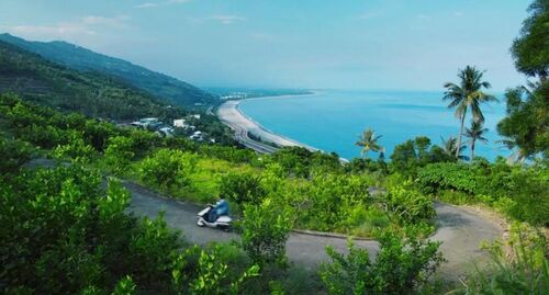 光很亮,天很蓝,海水净澈,树木葱郁。