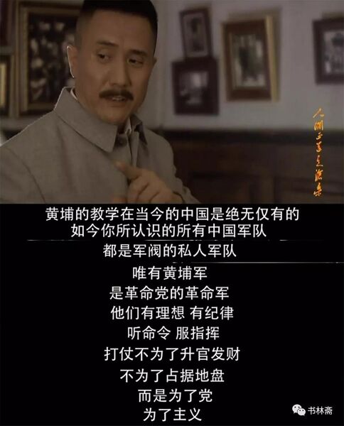 「黄埔的教学是当今中国绝无仅有的,如今你所知道的所有中国军队都是军阀个人的私家军队,唯有黄埔军,是革命党的革命军。他们有理想,有纪律,听命令,服指挥,打仗不为升官发财,不为占据地盘,而是为了党,为了主义。」