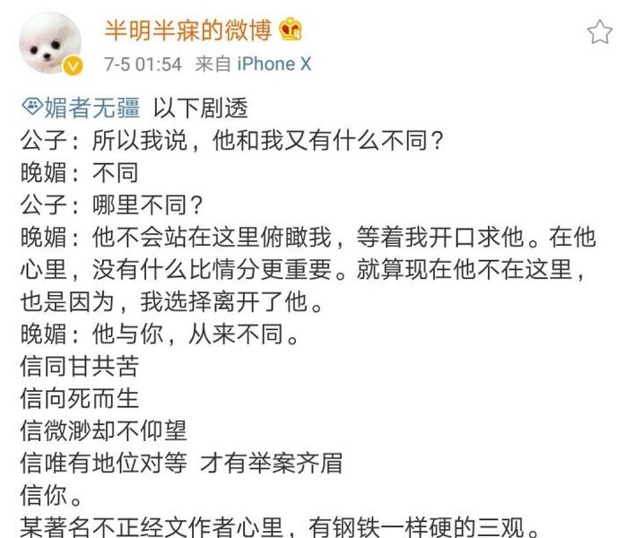 我有一段时间疯狂补过那些非常出名的小言,大概读了有两百多本。读下来喜欢的也不过三四本,觉得写得有水准的也不过一两本。到最后看到稍微差一点的,我都会因尴尬笑到抽搐。现在的我已经不怎么看这种东西了,凡是能让我看下去的必有过人之处。其中,《媚者无疆》的过人之处就在于有灵魂。