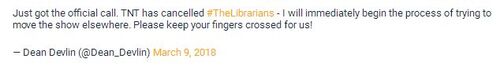 TNT于第四季完结约一个月后取消了图书馆员,制片人Dean Devlin表示在为图书馆员寻找新的播出渠道。