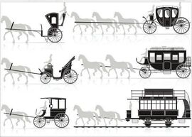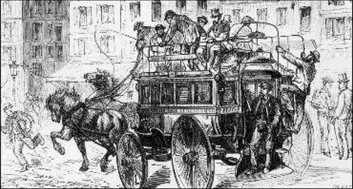 【1825年,一个名为George Shillibeer的马车制造商被委托制造了一种新型的更大的用于城市间交通的马车,omnibus(公共马车),能够乘坐16名乘客,由三匹马拉动。如下图: