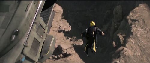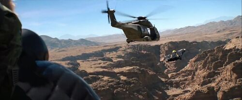 第三个很别扭,滑翔的人竟然可以飞进直升飞机里面。好,哪怕你不展示具体镜头,用远景回避掉物理逻辑就算了,你还专门拍了一个滑翔衣在螺旋桨下慢慢滑进机舱的镜头,你以为是停车入库侧方移位啊!螺旋桨这风量可以把直升机吹起来,却带不走这犯罪圈的史塔克?