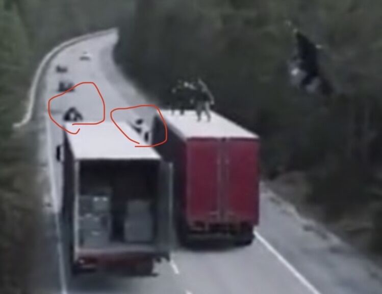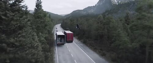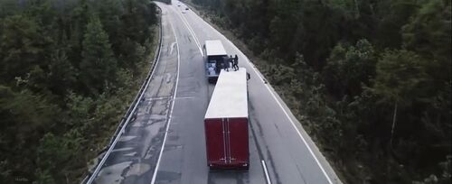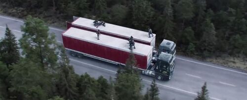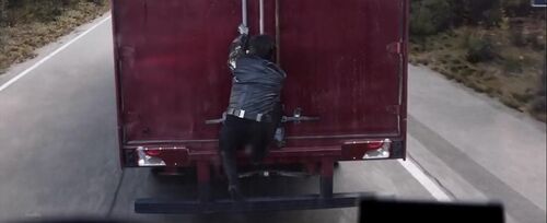 第一个问题,冬兵追疑犯的两辆大卡车,结果他选择的是爬上前车,在后车的司机眼皮底下打开车厢门。更奇怪的是,上图这个镜头已经是主观镜头了,说明后车司机就是看到了。这个从冬兵的角度出发,逻辑是极差极差的,它为的是后面冬兵被踹飞到后车挡风玻璃的效果。不然,就应该安排冬兵爬上后车才是。