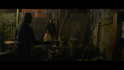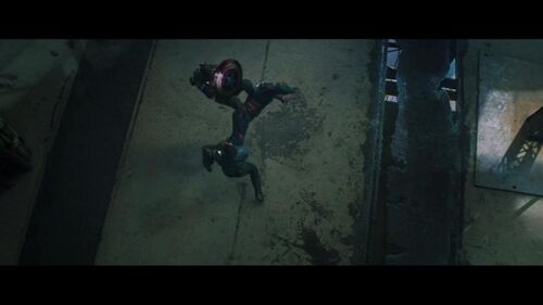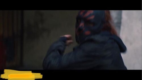 在这个极短的远景里,有卡莉快速戴上面具的动作。