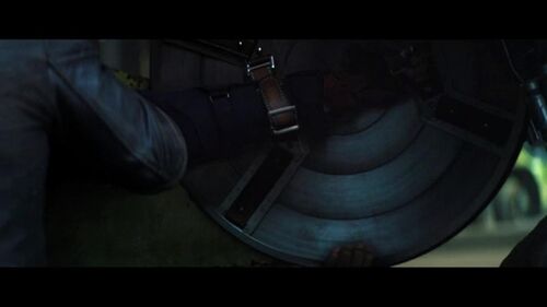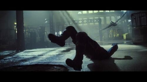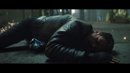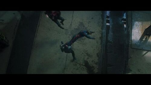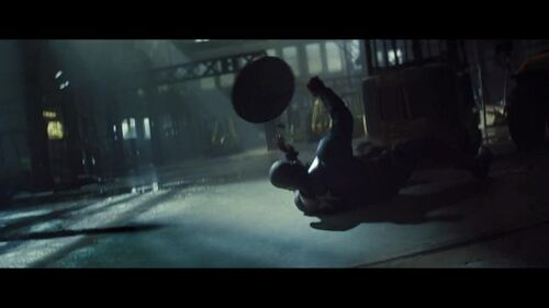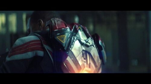 上面两图,冬兵被新美队一脚踢爆了,剪辑强调了他被踢到铁柱子上的力度,然后画面做了个他左臂漏电的特效。