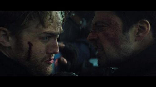 第二个失望的是动作逻辑,猎鹰出击一开始,进了运输机,一圈就把LAF的犯罪团伙全打趴了。一转眼,坏人头目莫名其妙把山姆压制住,然后这帮鸟人个个轻松悠闲地把滑翔衣穿好了,甚至有时间把人质绑在身上。这倒算了,怎么负责压制山姆的头目也穿好了?这里面有地面支援的交叉剪辑,我还以为山姆晕倒了,结果回头一看没有啊!还挺机灵地用翅膀挡子弹呢!敢情你刚才就是悠闲地在一边看着他们穿衣服啊?