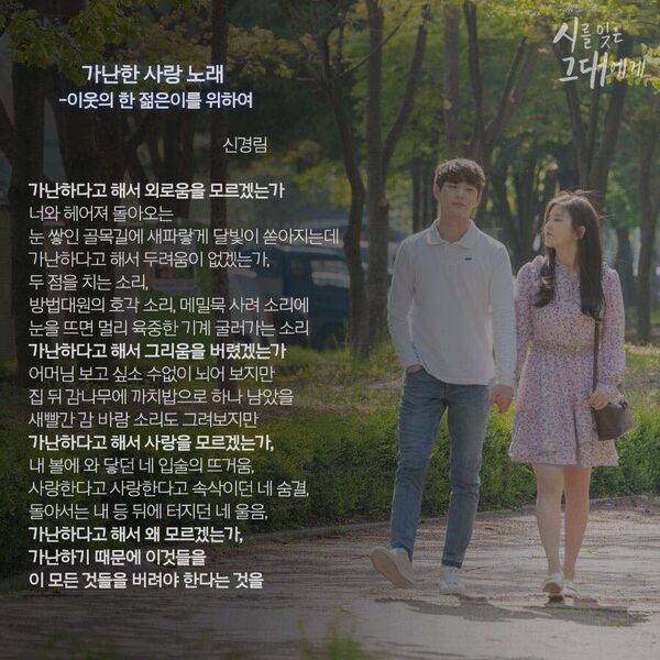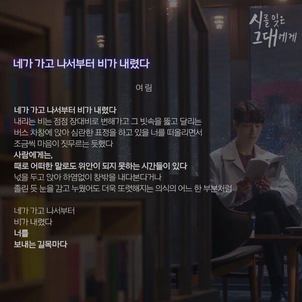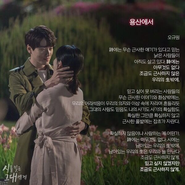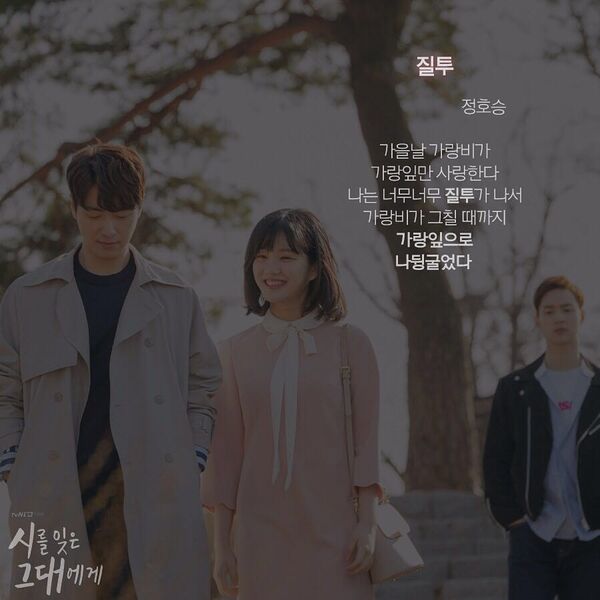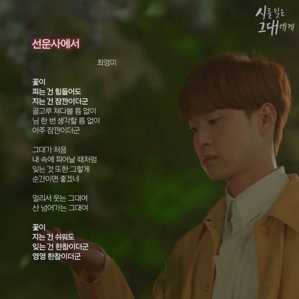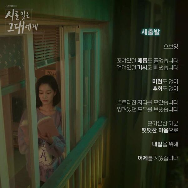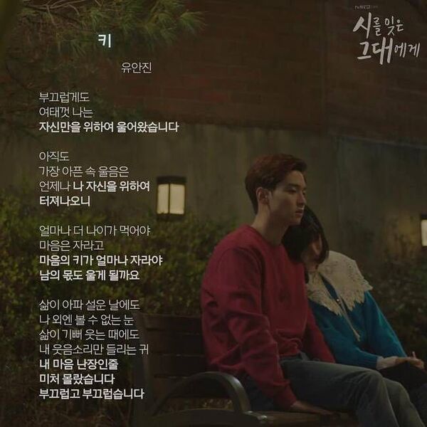 《致忘了诗的你》是一部关于医院工作人员的电视剧。故事主要讲述了理疗师禹宝英的故事。禹宝英曾经梦想成为一名诗人,但由于家境不好,她只能为了生计而选择成为一名理疗师。她是一个现代小市民,每天都为了生活而努力奋斗。另一位理疗师艺在旭也是故事的重要角色。他是最年轻的组长,从大学医院调任到综合医院。他的晋升速度非常快,备受瞩目。实习生申敏浩是一个出身于医学世家的人,他在保健大学就读,并进入医院实习。他对学习不感兴趣,更喜欢玩乐。然而,由于父母的威胁,他只能选择进入保健大学物理治疗系就读。复健科的实习生金南宇也是一个重要角色。他和朋友申敏浩一起在医院实习。他就读于保健大学,对于学习和玩乐都很感兴趣。这部电视剧由《独酒男女》制作社担任制作,《无理的英爱小姐》、《独酒男女》的编剧明秀贤执笔。曾执导《无理的英爱小姐》第8-15季的韩尚将担任导演,预计将在3月初与《Cross》接档首播。