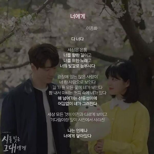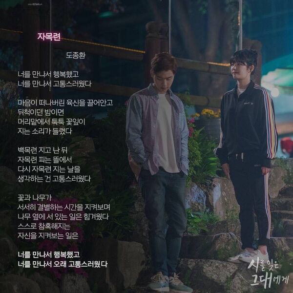 《致忘了诗的你》是一部以医院为背景的电视剧,主要围绕理疗师、复健治疗师、X光操作师等医疗工作者的生活展开。李侑菲饰演禹宝英,一位入职三年的理疗师,她从小就梦想成为诗人,但因家境原因选择了理疗师的职业,过着努力生活的平凡市民生活。李浚赫则饰演艺在旭,从大学医院课长职位调任到综合医院担任组长,是凭借超快速晋升而知名的最年轻组长。张东润饰演申敏浩,出身医学世家,在保健大学就读的实习生,虽然天性贪玩且学习不认真,但因父母的压力选择进入物理治疗系就读。辛载夏饰演金南宇,与申敏浩同校实习的朋友。该剧由《无理的英爱小姐》制作团队打造,明秀贤编剧执笔,并邀请韩尚在导演执导,预计于3月初接档《Cross》首播。