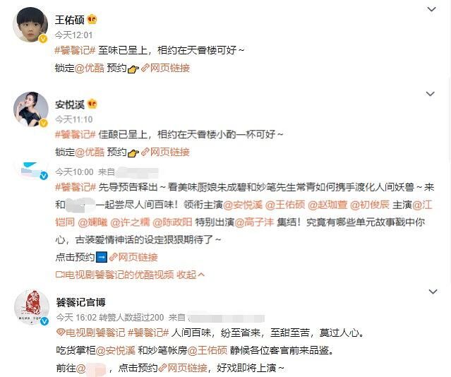 古装美食爱情神话类型网络剧《饕餮记》将至。昨天不仅看到某视频网站把该剧抬了上来,还看到该剧的播出方、官博、男女主都发布了动态。推测将在三月备播。该剧改编自殷羽的同名小说。看网友留言,说是上小学时的书,查了一下出版时间显示是2015年9月。讲述的是人妖殊途的曲折爱情,世人对妖兽的不同看法,妖兽与人相处的不同方式。跟妖兽相关的菜肴,及美食背后深刻的故事。
