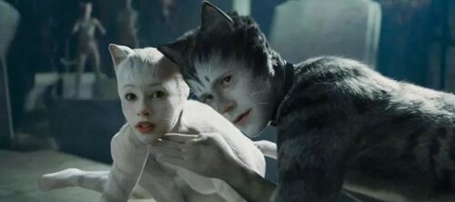 那些穿衣服的猫,穿也就算了,但你仔细看,有些猫只批了一件毛衣外套,但除了外套以外,他就什么都没穿了,没穿裤子没穿内裤没穿上衣只批了一件外套,对不起我看到这的时候心里只想到了“耍流氓”三个字。音乐剧的猫虽然也有穿衣服(披着猫服装)和没穿衣服的,但音乐剧和电影的属性有本质的区别,音乐剧和观众保持了距离,而且观众会潜意识切换成观看真人表演的模式,而且音乐剧的真人扮演的猫,是为了艺术表达的舞台妆扮不会产生恐怖谷效应,而这部电影则是创造了一种人脸猫的仿真奇怪生物,让人不敢恭维。