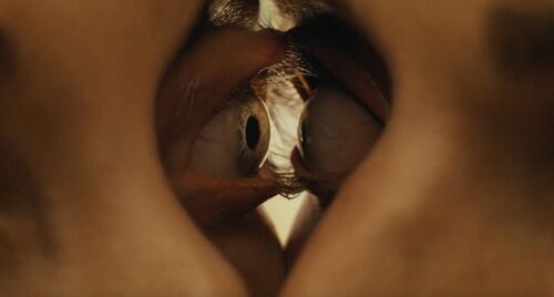 不适和疼痛的倒置挑战了顺性别异性恋插入式性关系中女性作为被动和疼痛的一方的常规,进而颠覆性别权力关系,也明确了影片不同于以男性虐待狂和女性痛苦的痛觉结构为核心的“酷刑色情”(torture porn)的创作立场。这种怪异的共生状态逐渐升级,夜里,在两人分房入睡后,他们失控地被对方吸引过去,尽管奋力抵抗,两人的手臂还是彻底融合在一起。次日,米莉将蒂姆绑在凳子上,咬紧牙关用锯子将两人的手臂锯开,让影片的痛感再次达到高潮。在绝望中,蒂姆和米莉分头行动,影片在一段精彩的交叉剪辑中揭开真相:蒂姆重新回到森林中的洞穴,一个怪物般的生物向他爬来——这正是此前失踪的那对情侣,两人的头颅和身体互相融合,一把刀插在合体人的头颈,意味着其中一人在合体前或合体时已受重伤或死去。与此同时,米莉敲开了独居的邻居兼同时杰米(达蒙·海瑞曼饰)的门,她在杰米的家中看到一段录影:这段录影记录了“杰米”此前的人生——他们曾是一对同性伴侣,信奉“合体”的邪教,在婚礼后,他们和信徒们一同进入洞穴,众人见证了他们的合体。杰米告诉米莉,合体是上天的恩赐,合体的联结将使两人不再有隔阂,共享恐惧和记忆,等待她的是“神性血肉中的极致亲密”。震惊而恐惧的米莉挣开杰米,此时蒂姆也从洞穴返回家门口,无法抗拒的吸力再次将两人拉向彼此。