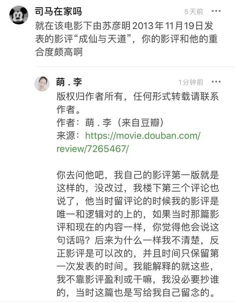 虽然他在我的影评之上加入了自己的语言,但也不难看出其中的重合度,而且我只是截取了两张做例子而已,更多的我还没有截出来,明眼人一看就知道怎么回事,想问这位道兄“偷”影评的时候,有想过祖师爷的教诲吗?能不丢道教的脸吗? 这些人在未通知原作者的情况下厚颜无耻的把人家的东西拿来用,并享受着粉丝对他们的赞美,甚至是收取相关收益,说实话,类似的事情,并不少见,不用说豆瓣影评,就是那些被八出来的抄袭小说,也不在少数,我只是微不足道的一个受害者而已,我看着大家给我的举报也无能为力,当初有人告诉我微博上那位加V的“刘哔电影”做的一篇关于《双瞳》的解析是抄袭我的影评,我当时有用微博给她发私信质问他,然而并没有什么回应,虽然生气却也很无奈。这些人就是上学的时候抄作业,考试的时候抄别人,得了高分还洋洋得意的人长大了而已,骨子里就是个没有才华又贪慕虚荣的蛆。 我来说说我写这篇影评的初衷,我在还未加入豆瓣的时候在电视上看过这部电影,印象很深,后来我又看了第二遍第三遍,由衷的喜欢,然而翻遍了当时的豆瓣和其他电影网站,包括百度贴吧,都没有一篇跟我观点相似的影评,注意没有一篇,而且许多人因为没看懂而打了低分,当时的豆瓣总评分是6.5分,让我为这部电影可惜,于是我才决定把自己的观点表达出来,帮助那些没看懂的人。这是我当时发的微博
