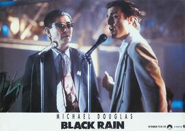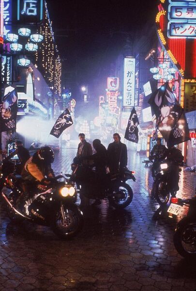 接下来的才是这部电影的主题情节——美国英雄在异邦的闯荡。而这个异邦,正是当时美国的最大挑战者日本。这是一种古老的戏剧主题:主人公被放逐,到异邦闯荡,然后重返故地,最终成为英雄。李小龙的猛龙过江就讲一个身怀绝技的中国人在罗马怎么牛逼的故事。但是黑雨里的尼克和李小龙正相反,他遭遇的是一次失败的旅程,一下飞机罪犯就被假冒日本警察的黑帮份子骗走,保守的日本警方对他们处处防范,他的佩枪被收缴,行动处处受制;再加上语言不通,文化不同,又没拜过码头,他连自己要对付的人是谁都不了解,尼克的美国英雄主义完全没有用武之地,更惨烈的是朋友查理陷入了斋藤的埋伏(斋藤也是一个摩托骑手,他带领飞车党将查理围起来),当着他的面被杀。